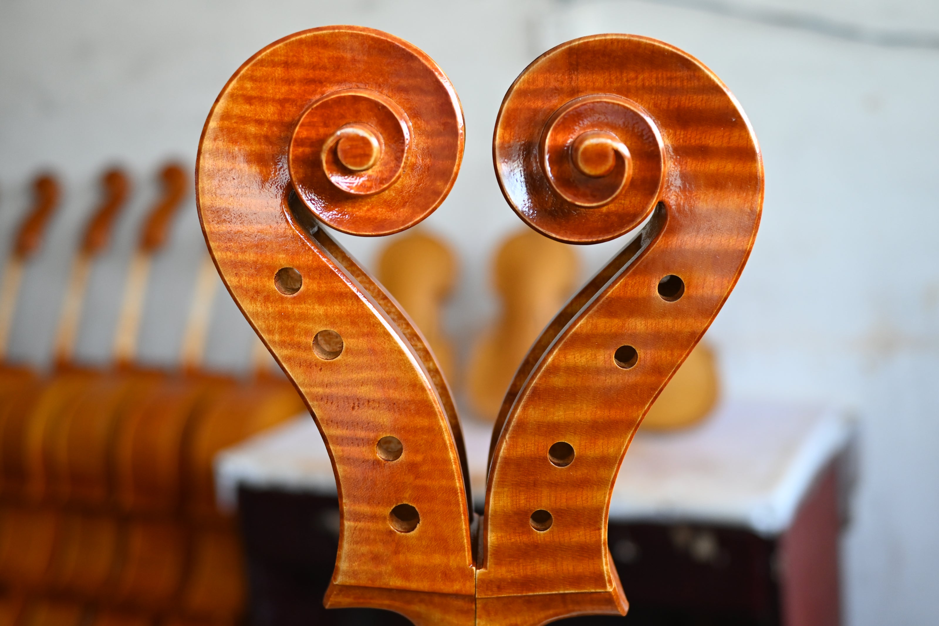 Curving a scroll is like creating something new from nothing. Every scroll has its own character. It's not the luthier's character, but the player's. It's the pursuit of excellence and music.