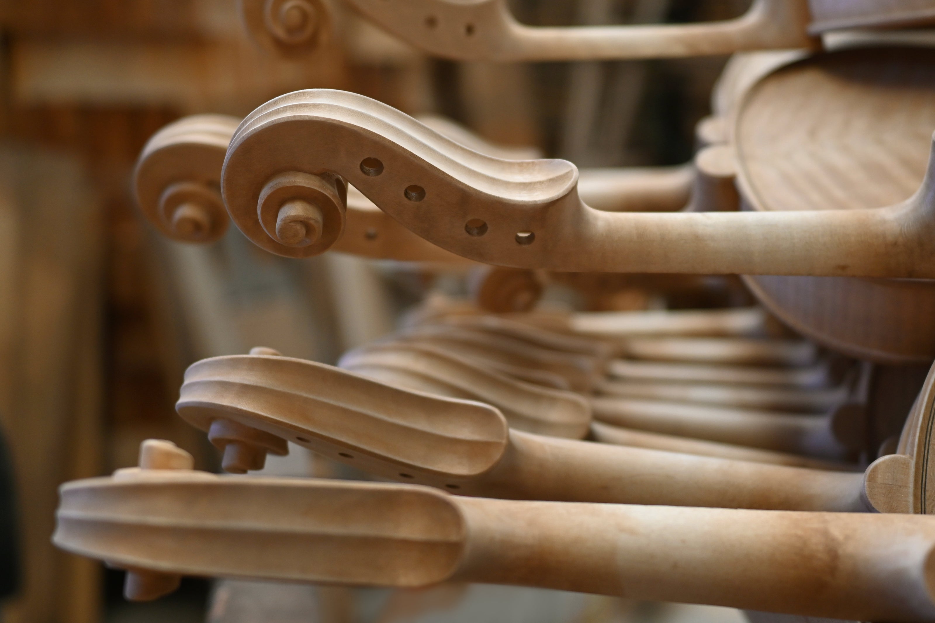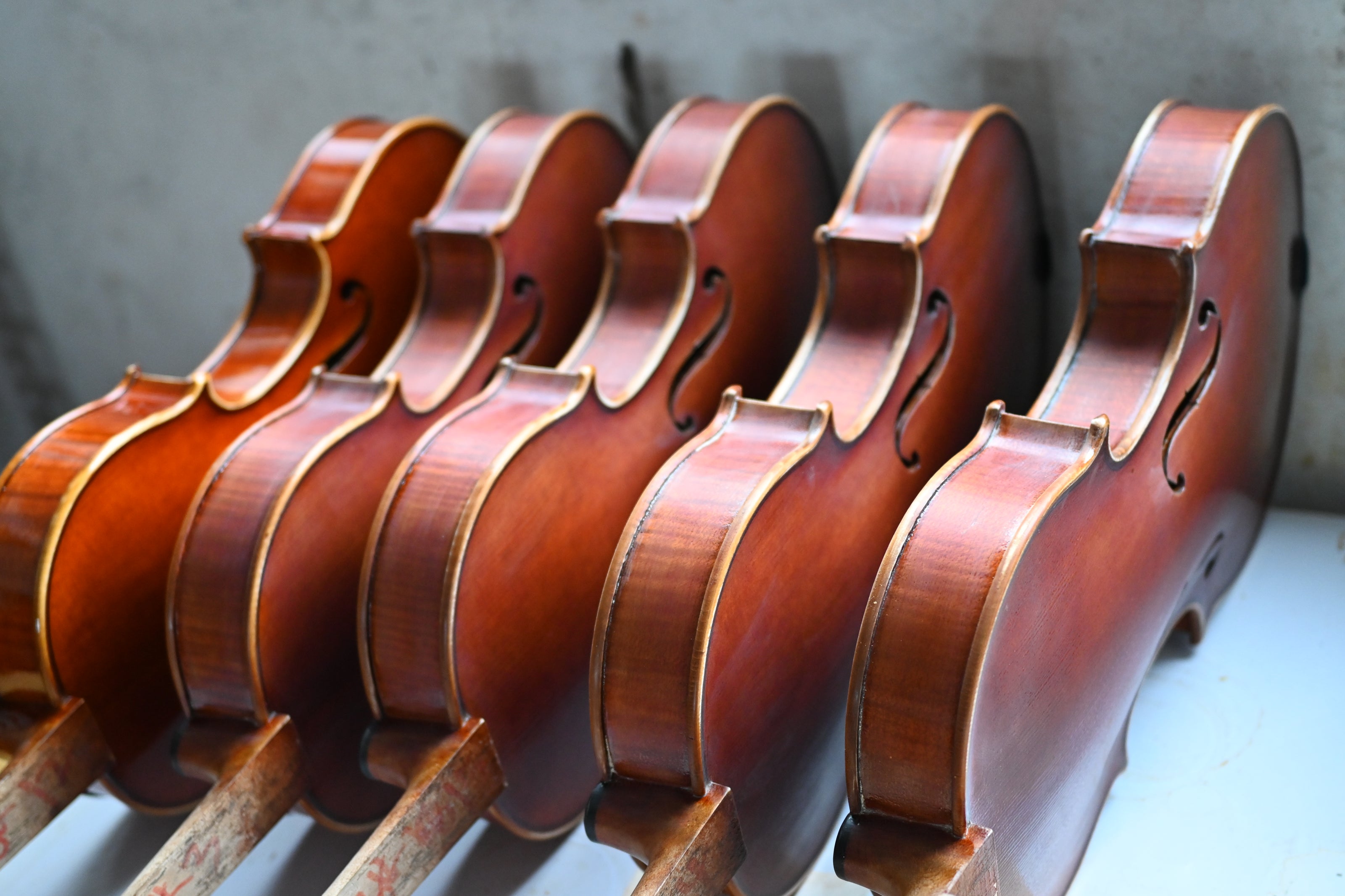 Instruments are carefully varnished and left to dry, allowing the wood to breathe and the color to deepen naturally.